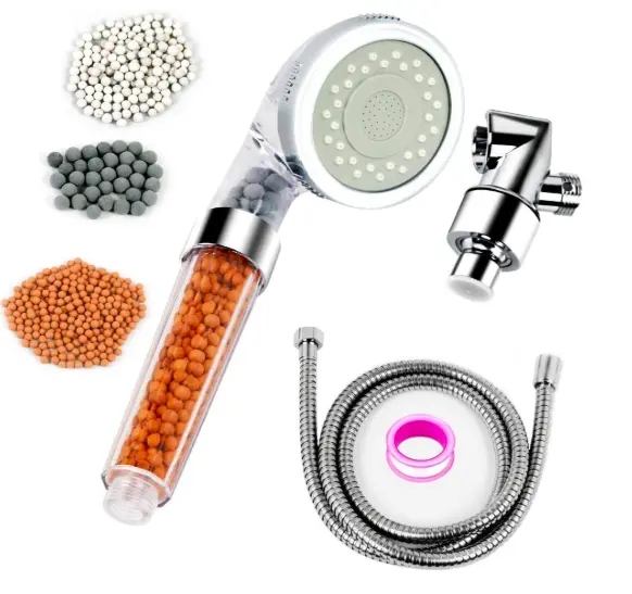 Cabezal de ducha con filtro de alta presión, manguera y soporte de repuesto.
