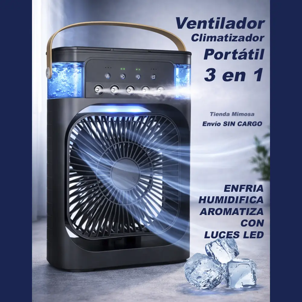 Ventilador Climatizador Portátil 3 en 1 - ENFRIA, HUMIDIFICA Y AROMATIZA - CON LUCES LED